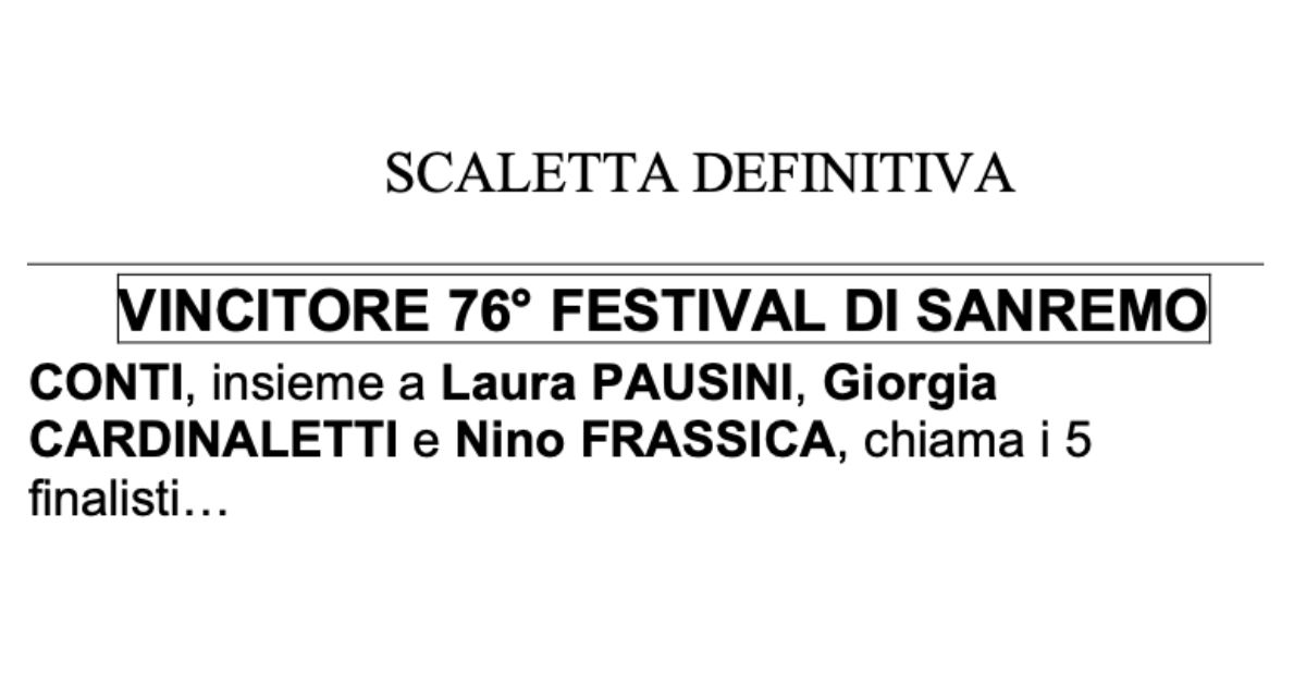 Carta canta, ed è arrivata la Bibbia della serata finale. Siamo in grado di fornirvi in anteprima esclusiva la scaletta ufficiale minuto per minuto dell’ultima puntata del Festival di Sanremo 2026. Carlo Conti, Laura Pausini e Giorgia Cardinaletti ci guideranno in una maratona che si preannuncia indimenticabile, tra colpi di scena clamorosi (Bocelli entrerà all’Ariston a cavallo!) e momenti di profonda riflessione.
